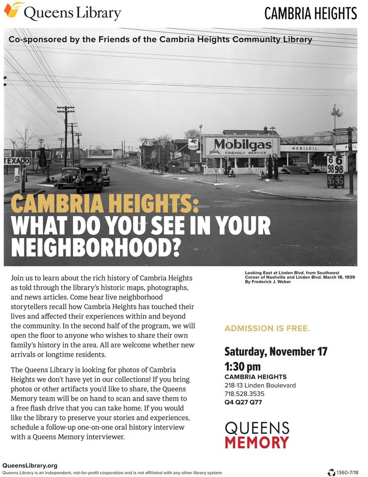 Join neighborhood storytellers who share the past, present, and the future they see when they look at Cambria Heights. Examine historic photos and maps of Cambria Heights from the library’s collections, and bring your own family’s stories and photos to share. The Queens Memory team will be on hand to scan and save them to a free flash drive that you can take home. For more information, contact us at digitalarchives@queenslibrary.org.