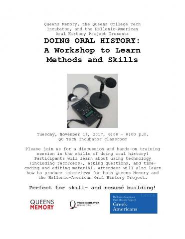 We will conduct a hands-on training session on the Queens College campus for volunteers who want to learn or brush up on their oral history interviewing skills. The workshop, which is co-sponsored by the college’s Tech Incubator and Hellenic-American Oral History Project, will cover such topics as interviewing techniques, recording technology and the creation of timecode outlines. The training is free and open to all volunteers; please RSVP via Eventbrite link above or email Lori.Wallach@qc.cuny.edu for more information.