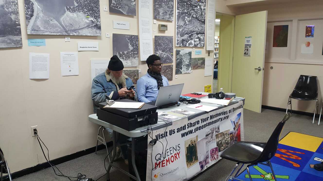 The Queens Memory Program was hosted by the Friends of the Douglaston/Little Neck Community Library, and the Douglaston and Little Neck Historical Society for a community history event. The Queens Memory team scanned neighborhood photographs, postcards and other memorabilia and saved them to a thumb drive that patrons took home with them. The event had light refreshment and limited seating. Featured from left to right are: Peter Turecamo (Douglaston Resident) and CUNY Work Fellow Deslie Promesse.