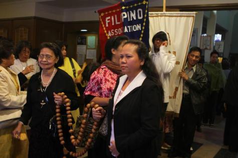 (Photo credit: October 2010 — outgoing Hermana Mayor Ely Villamin [left] with incoming Hermana Mayor Gloria Feliciano [right] at St. Michael’s Church in Flushing, Queens, prior to the start of the “La Naval de Manila” procession.)