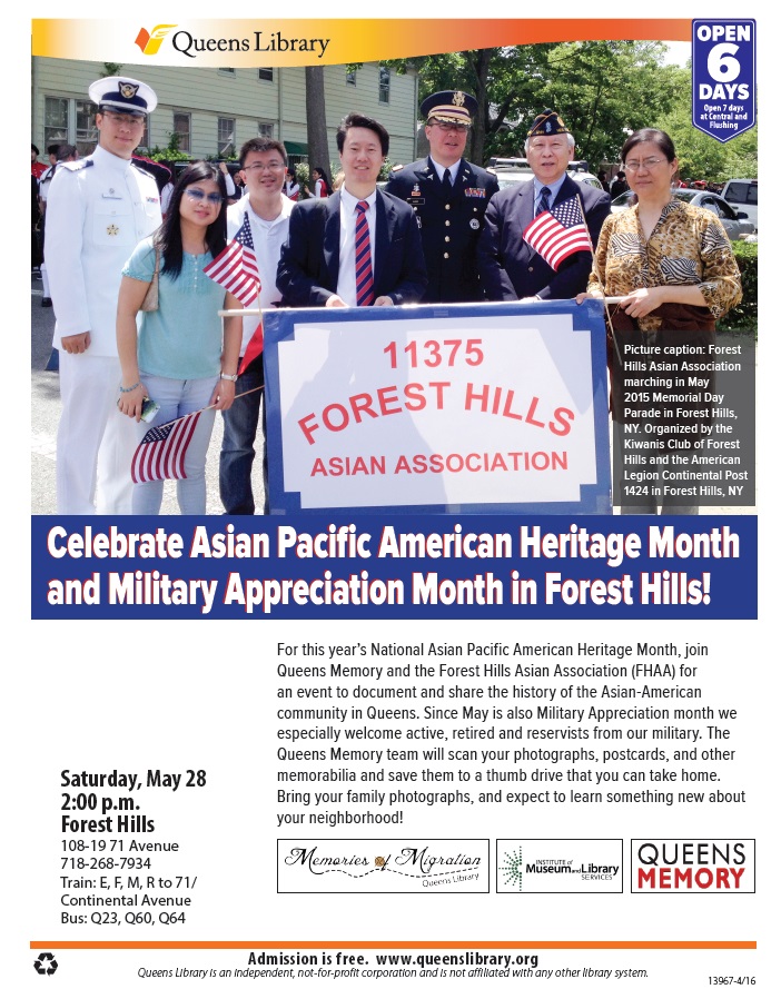 This event was a celebration of Memorial Day as well as Asian Pacific American Heritage Month. The Forest Hills Asian Association’s mission is to “advocate, collaborate, and engage with the businesses, families, professionals, seniors and all residents within the community.” By partnering with them, the Queens Memory team knew their membership would definitely show up on the day of the event with historic photos and other items from home that we could digitize for them and add to the library’s online archival collections.