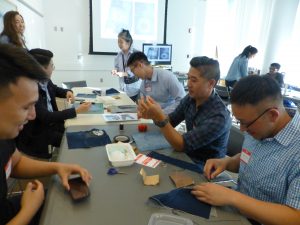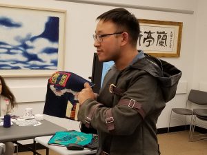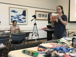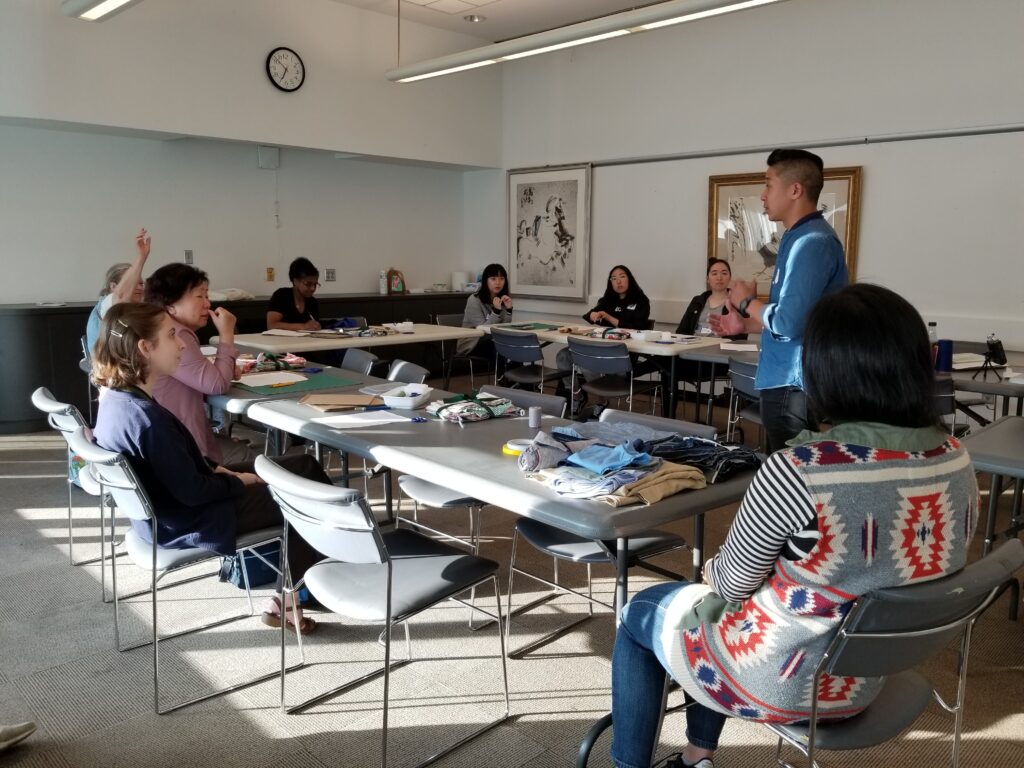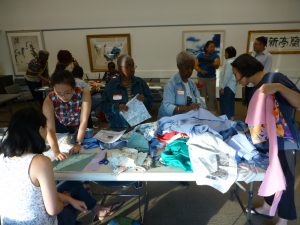 Our opening session! After introductions and an overview of the project given by Naomi and Natalie, our first instructor, Stephen Au, demonstrated techniques of “distressing” denim, based on his years in the fashion industry. Our 12 participants enthusiastically began working on their denim quilt blocks while Stephen shared stories of his family and assisted the quilters individually. We set up audio recorders to capture Stephen’s presentation as well as any stories our participants chose to share for possible inclusion in the finished story quilt; we plan to do this for each working session.