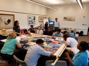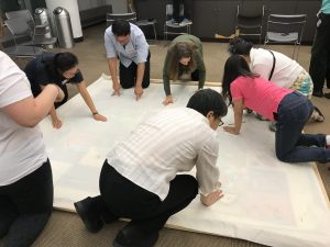 Before this session took place, Naomi spent a good deal of time at her Queens College studio selecting and assembling the 64 blocks that would make up the finished quilt. She basted them together on a large fabric backing and constructed a wooden frame to use in the workshop. Our instructor, Helen Griffin, helped show participants how to sew on the blocks to make it a true quilt. The frame needed to be disassembled for storage at the end of our session, and our quilters enthusiastically pitched in to help!