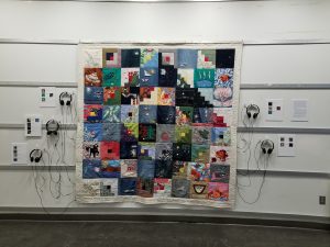 In November 2019, the Community Story Quilt returned to its place of creation in Flushing Library. The quilt will be on permanent display in the third-floor conference room, where our quilting and recording sessions took place in summer 2018. Although the LilyPads will not be operational in this setting, three binders containing transcriptions of the audio clips (in English, Spanish and Chinese) are provided on a stand next to the quilt; the clips also continue to be available for listening on YouTube.