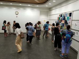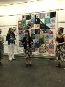 A few days before the exhibit, Natalie, Naomi, our panel moderator and one of the panelists visited the space. This helped immensely to get a sense of how the quilt could be arranged for attendees to see it up close and listen to the audio clips. We also put together a slideshow of images from throughout the summer to display during the event.