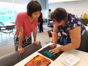 Natalie and Naomi met with Yang Zeng, director of the Flushing Library, about plans to have the Story Quilt installed as a permanent exhibit at the library. This represents a full circle for the quilt, as it will be displayed in the third-floor conference room where it was created in our workshops! The timing of the installation has not yet been decided, as we plan to show the quilt in several more venues in the coming months, and the library intends to repaint the room soon as well. When the quilt is installed, we will make printed transcripts of the audio clips — in English and Chinese — available for patrons. We also agreed to explore options for making the playback technology more robust for ongoing use.