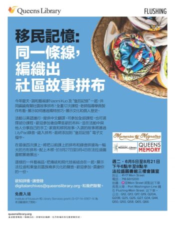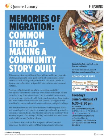 We advertised the workshops via flyers in the Flushing Library; through email lists administered by Queens Library, Queens Memory, Queens College and local arts organizations; and through the social media outlets of all the participants, including our four quilting instructors. We had our flyer translated to reach out to the large number of Chinese-speaking patrons at the Flushing Library.