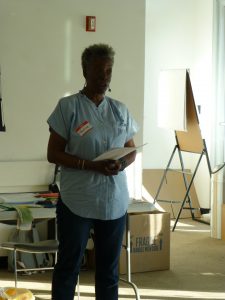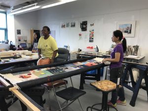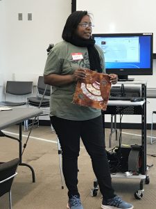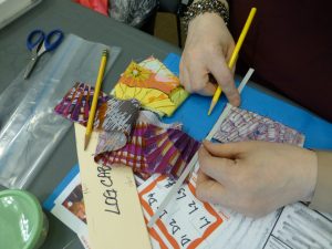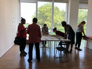 Naomi and Lori met with quilting instructor Thadine Wormly at Naomi’s studio at Queens College. They went over the project concept and brainstormed about stories and techniques Thadine could share during the workshops. Thadine and Naomi both shared examples of their textile work. Prior to this meeting Naomi attended a Quilt-n-Queens guild meeting at the Jamaica Center for Arts and Learning, where Thadine is a longtime member and was leading the evening’s activities.