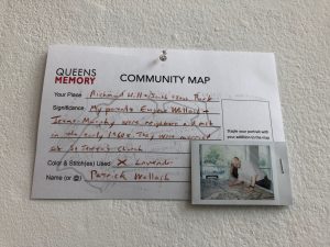 This evening was a wonderful celebration of our Story Quilt project. The gallery was filled to capacity to hear our panel speakers — Naomi, Natalie, Thadine and workshop participant Annie Hung — discuss the questions posed by moderator Alisa Martin of the Tenement Museum. Following the conversation, the audience was invited into a side room to view the quilt up close and listen to the audio clips via headphones. Also on display was the gallery’s current exhibit, “Handstitched Worlds,” which featured a number of exquisite quilts from various periods of history. As an additional treat, attendees were invited to stitch their own memories onto a fabric map of Queens in the gallery’s ongoing participatory embroidery project, “Our Queens.”