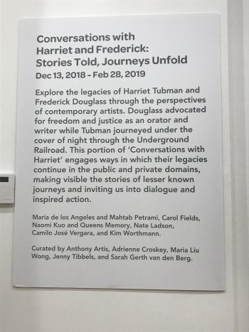 This evening marked the opening of the gallery’s exhibit, “Conversations with Harriet and Frederick: Stories Told, Journeys Unfold,” in which our quilt is included. A standing-room-only reception featured an artists’ panel discussion, with Naomi representing our project. We were happy to see so many visitors engaging with the quilt and listening to the audio clips; gallery staff members have graciously agreed to monitor and recharge the batteries while the quilt is displayed. Among the guests were one of our quilting instructors and three other workshop participants.